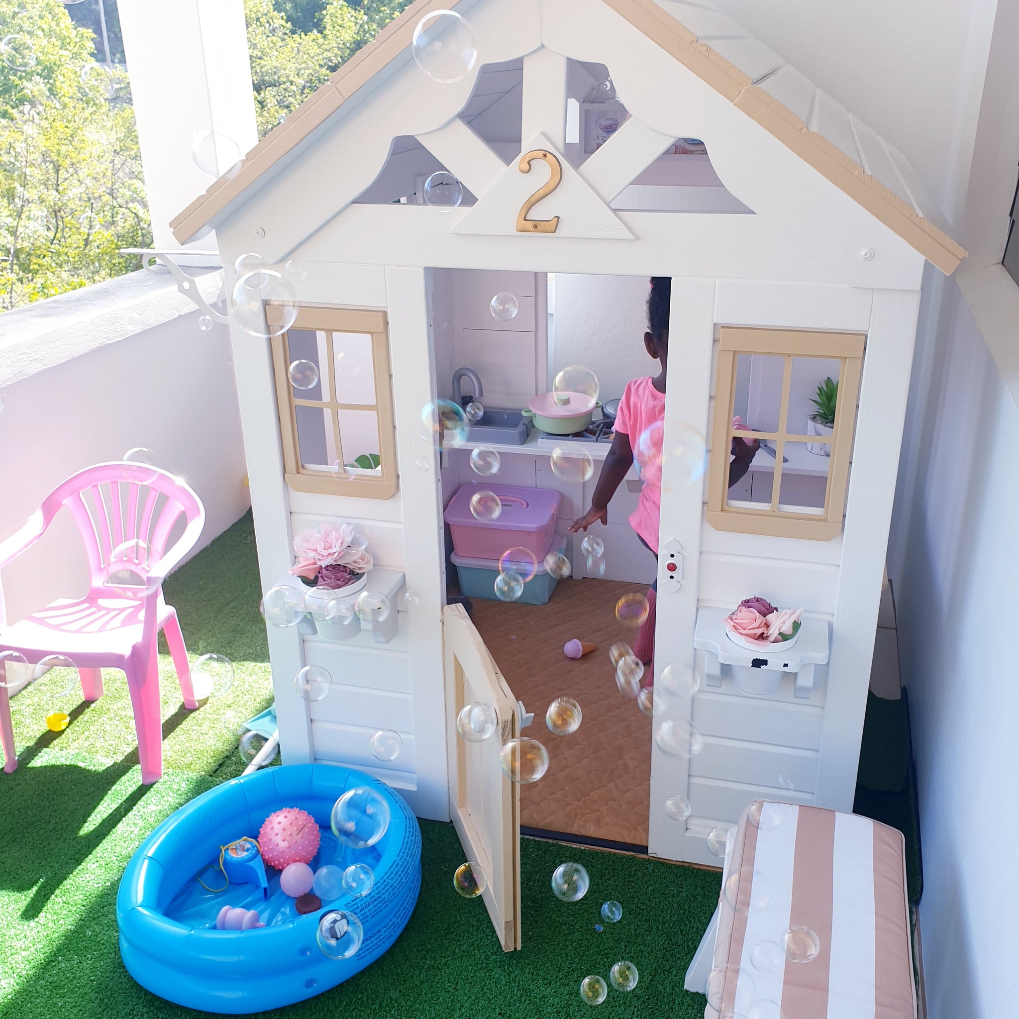 • Included: Sink, Stove, Cordless phone, Working doorbell, Side snack window, Flowerpot holders , Pot and Pan set with utensils