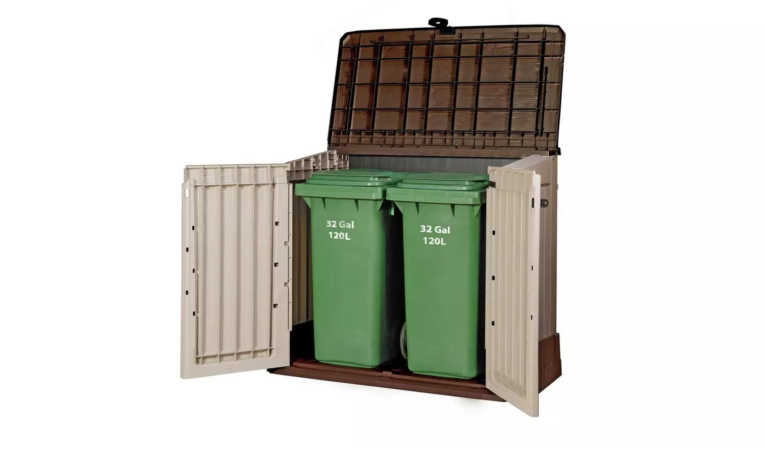This storage shed is the all-purpose outdoor storage box, ideal for garden tools, furniture and equipment or two 120L wheelie bins. Providing dry and ventilated storage, piston assisted lid and two wide opening doors for easy access to contents. There are also two lid-lifter chains included to facilitate hands-free opening. Durable and weather resistant design that is virtually maintenance and fade-free with heavy duty floor included and lockable feature for added security. External Dimensions: L:130cm W:74cm H:110cm.